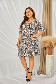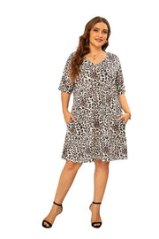 Leopard Plus Size Short Sleeve Midi Dress with Pockets