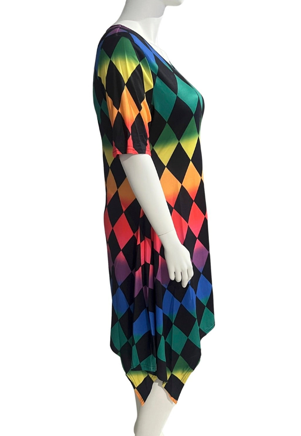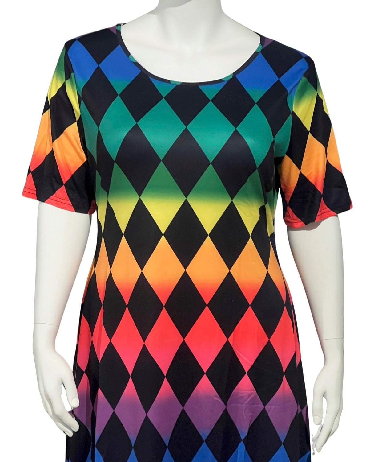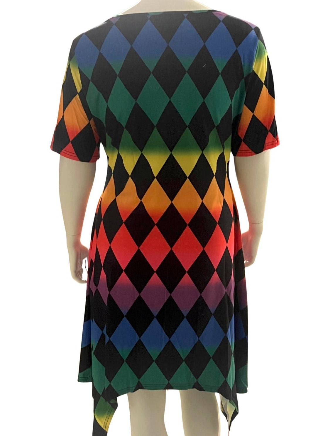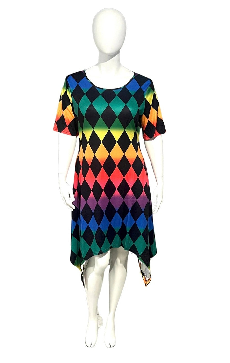 This Plus Size Multi Colour Rhomboid Check Printed Dress is made of high-quality polyester for a comfortable fit. With a crew neck and short sleeves, it offers a casual style perfect for any occasion. The unique hemline adds a touch of flair, while the colourful, check pattern makes this Midi Dress a fashion statement.