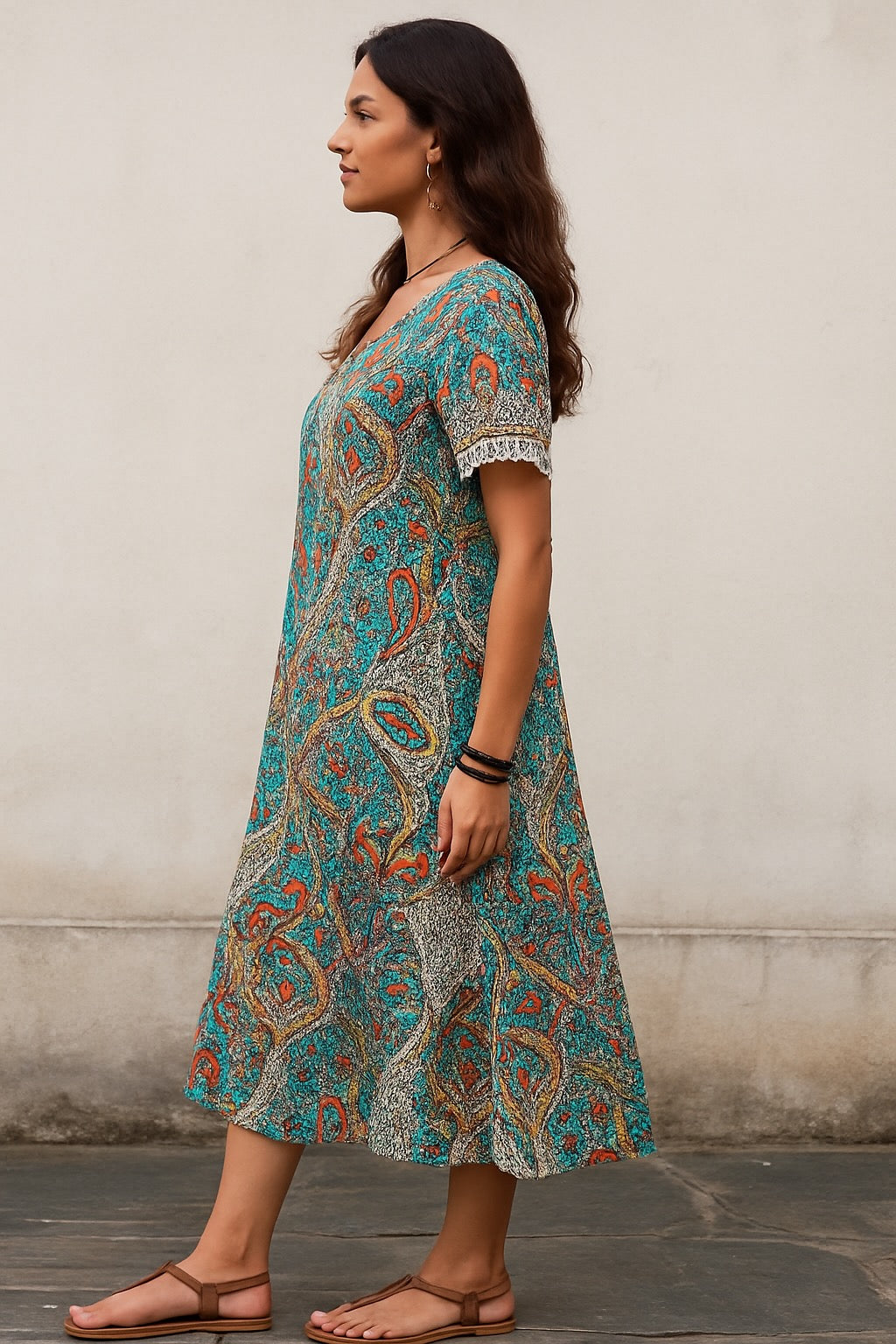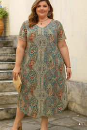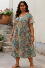 Plus Size Paisley Print Dress | Boho Short Sleeve V-Neck Curved Hem Dress – Lightweight Woven Fabric for Spring & Summer