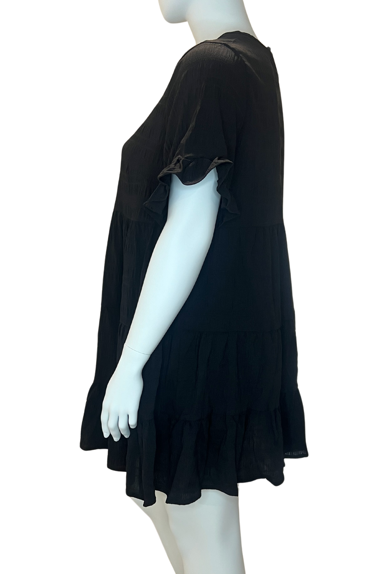 This Black Short Sleeve knee Length Tiered Ruffle Dress is the perfect addition to any casual wardrobe. With its light weight and relaxed fit, it's both comfortable and stylish. Plus, its tiered ruffle design adds a touch of boho flair. Perfect for any plus size individual looking for a versatile and fashionable dress.