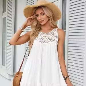 Enhance your summer wardrobe with our Women's Sleeveless Party Dress. Perfect for beach wear or any special occasion, this dress features a stylish ruffle hem and tiered design. Made from 100% polyester, it offers a cool and comfortable fit. Bring a touch of elegance to your style with this sleeveless dress.