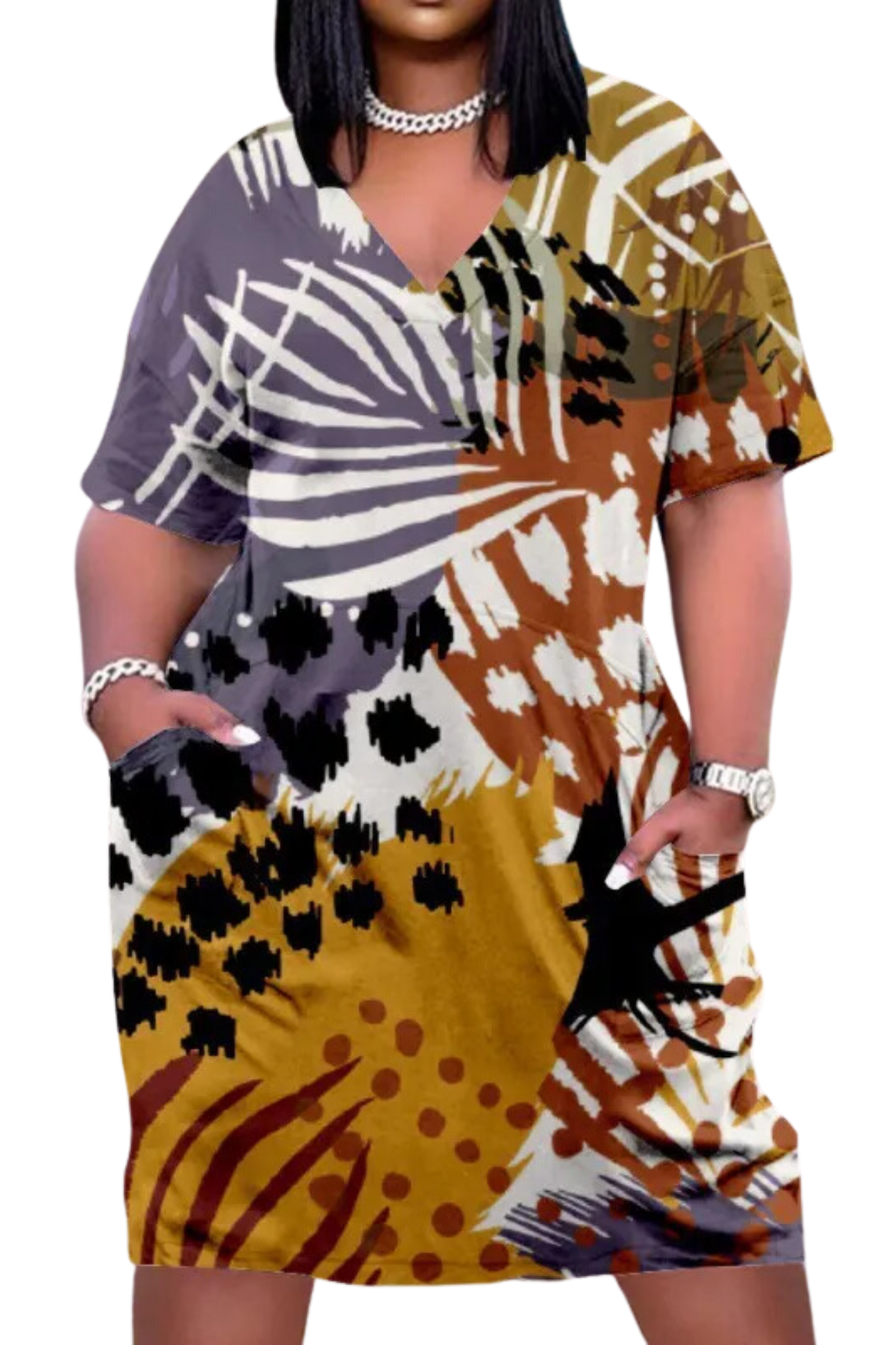 Stay on trend with our Abstract Pattern V-Neck Plus Size Knee Length Dress. Made with comfortable polyester, it features a relaxed fit and regular sleeve for casual wear. The natural earthy colours will elevate your style.