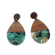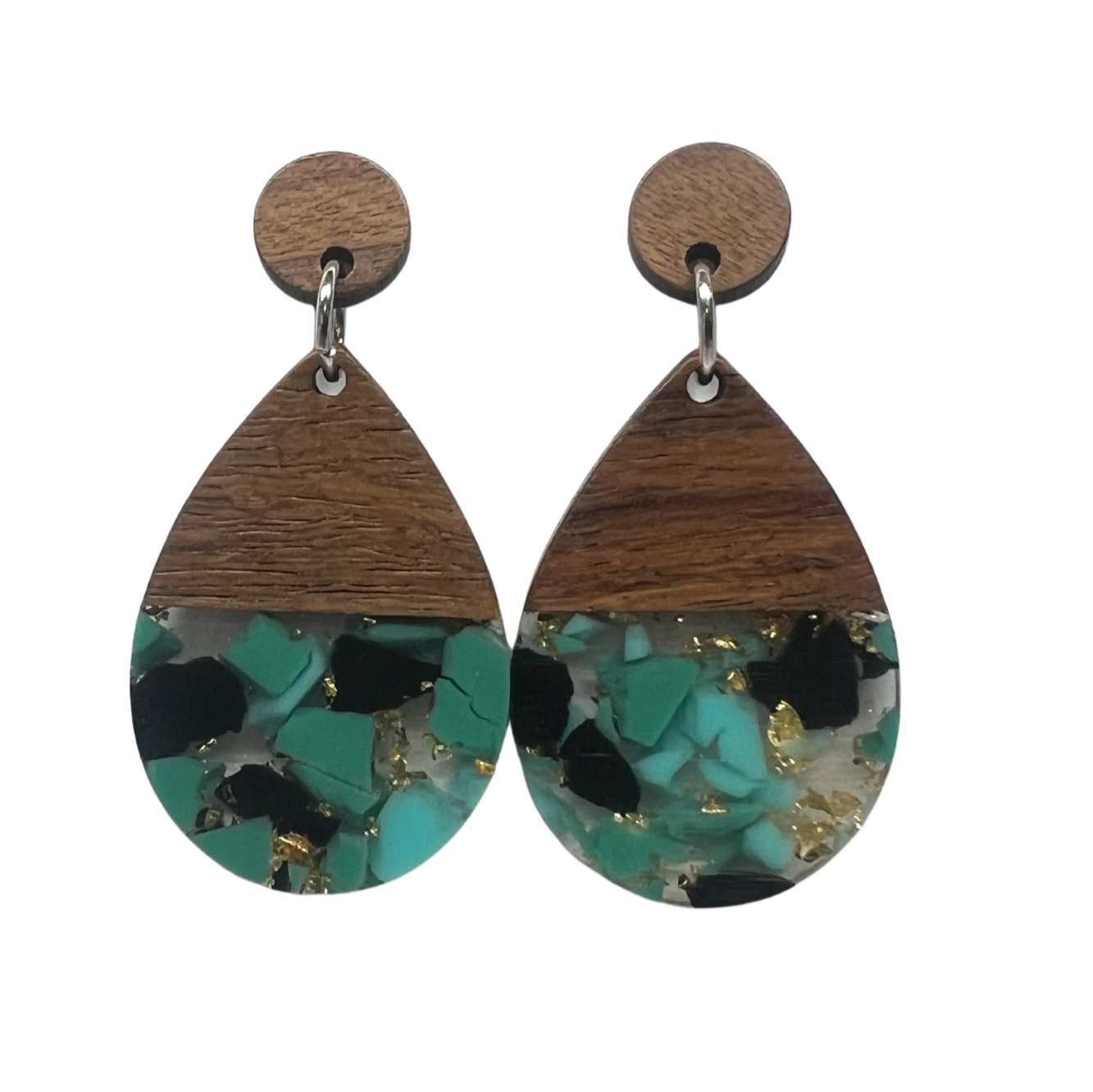 Teal, Black & Gold Resin & Wood Stud Dangle Earrings.
