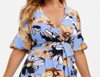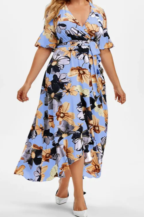 Blue Floral Bohemian Print Ruffle Womens Plus Size Midi Dress