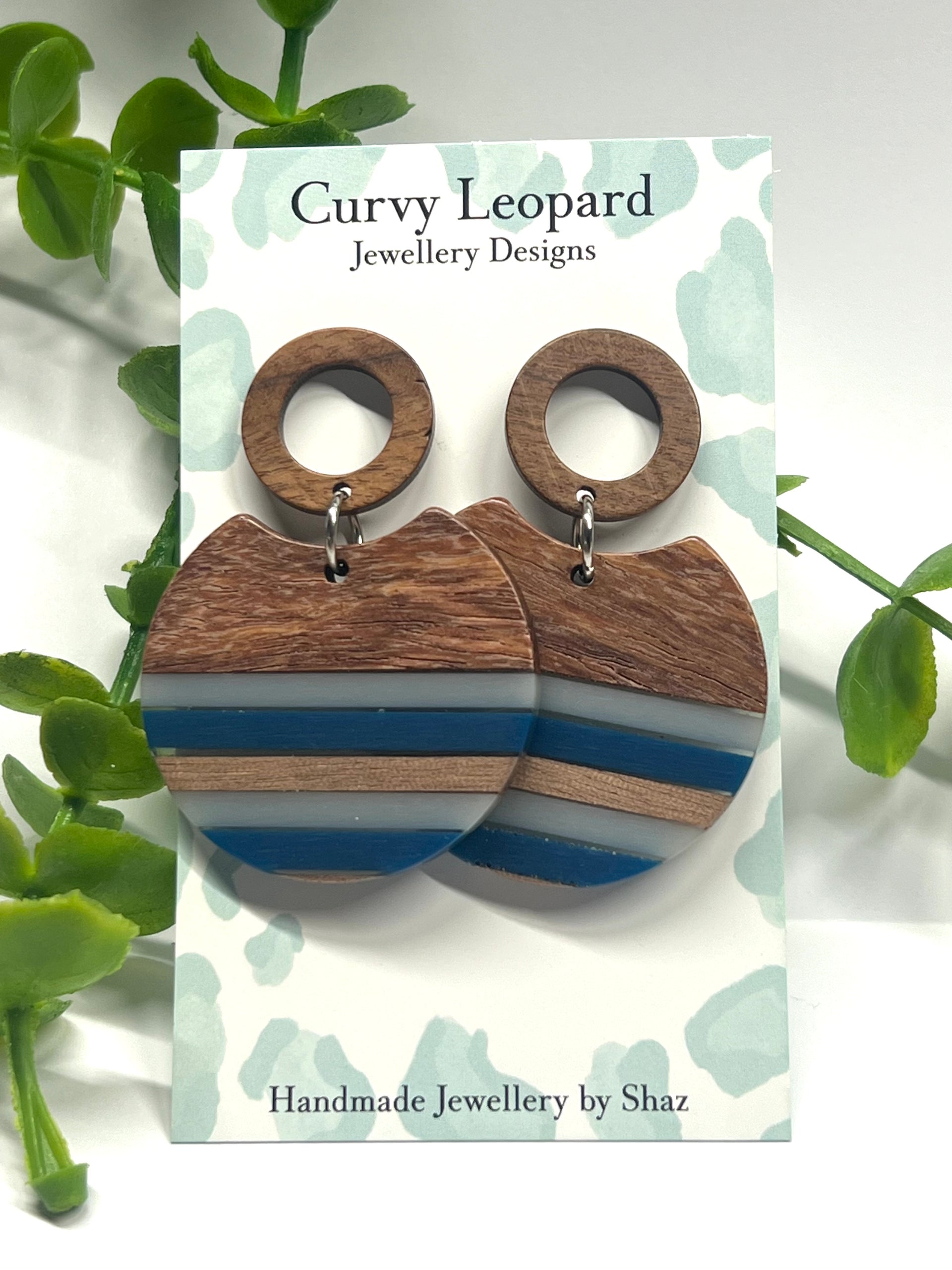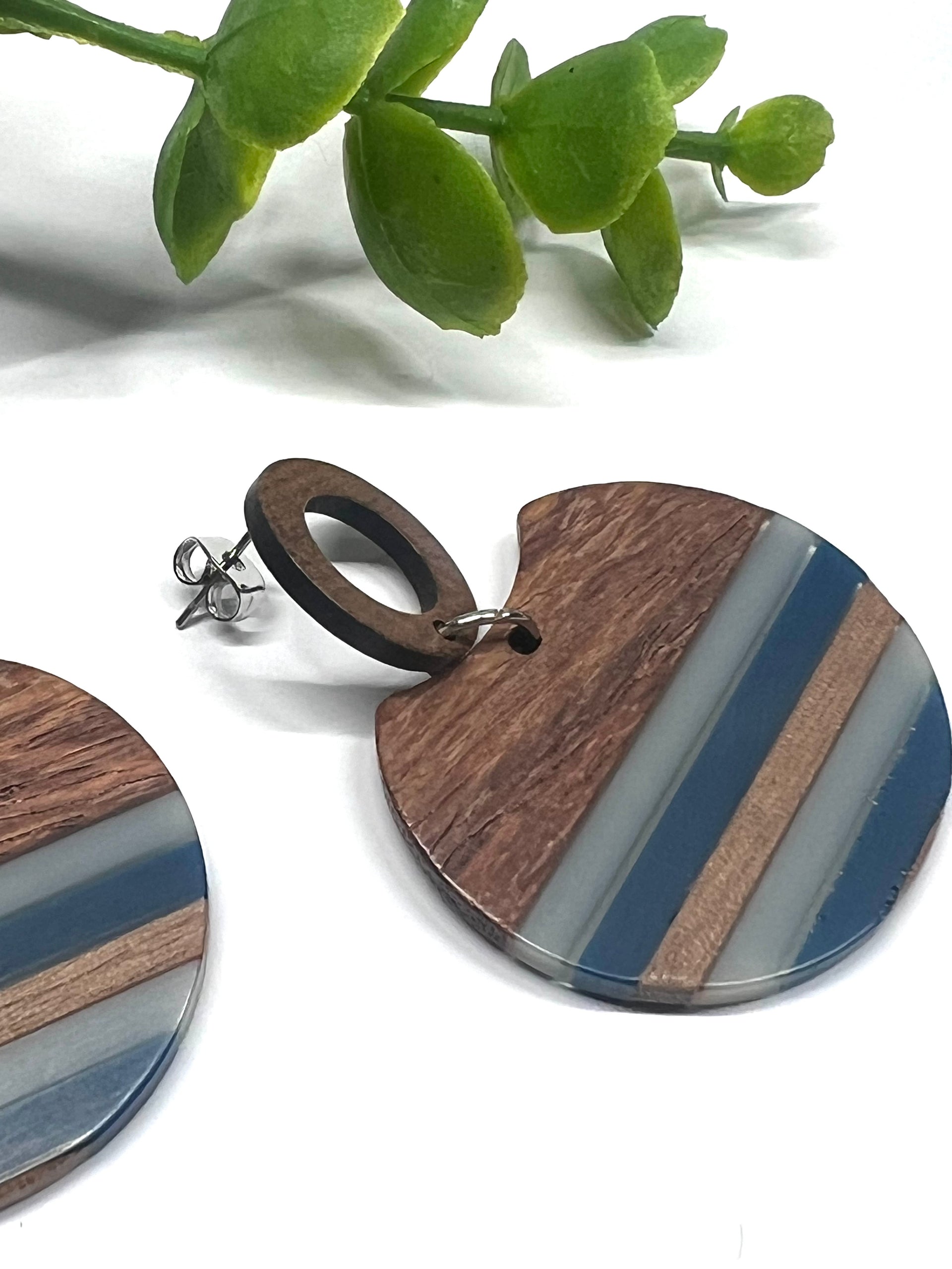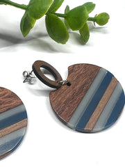 Blue Denim Stipe Wood & Resin Stud Dangle Earrings.