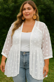 Embrace effortless style with our Plus Size Swiss Dot Open Front Kimono, the perfect piece to elevate your spring and summer wardrobe. Designed with curvy figures in mind, this chic and flowy kimono features delicate lace stitching and a semi-sheer Swiss dot woven fabric for an elegant yet breezy look.
