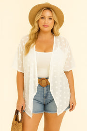 Add effortless elegance to your summer wardrobe with this Solid Swiss Dot Open Front Blouse. Designed with a bolero-style silhouette, it features delicate Swiss dot texture and an asymmetrical open front for a refined, lightweight layering piece. Perfect for warm-weather vacations or everyday outings, this semi-sheer blouse drapes beautifully over dresses, camisoles, or tank tops to create a polished yet relaxed look.