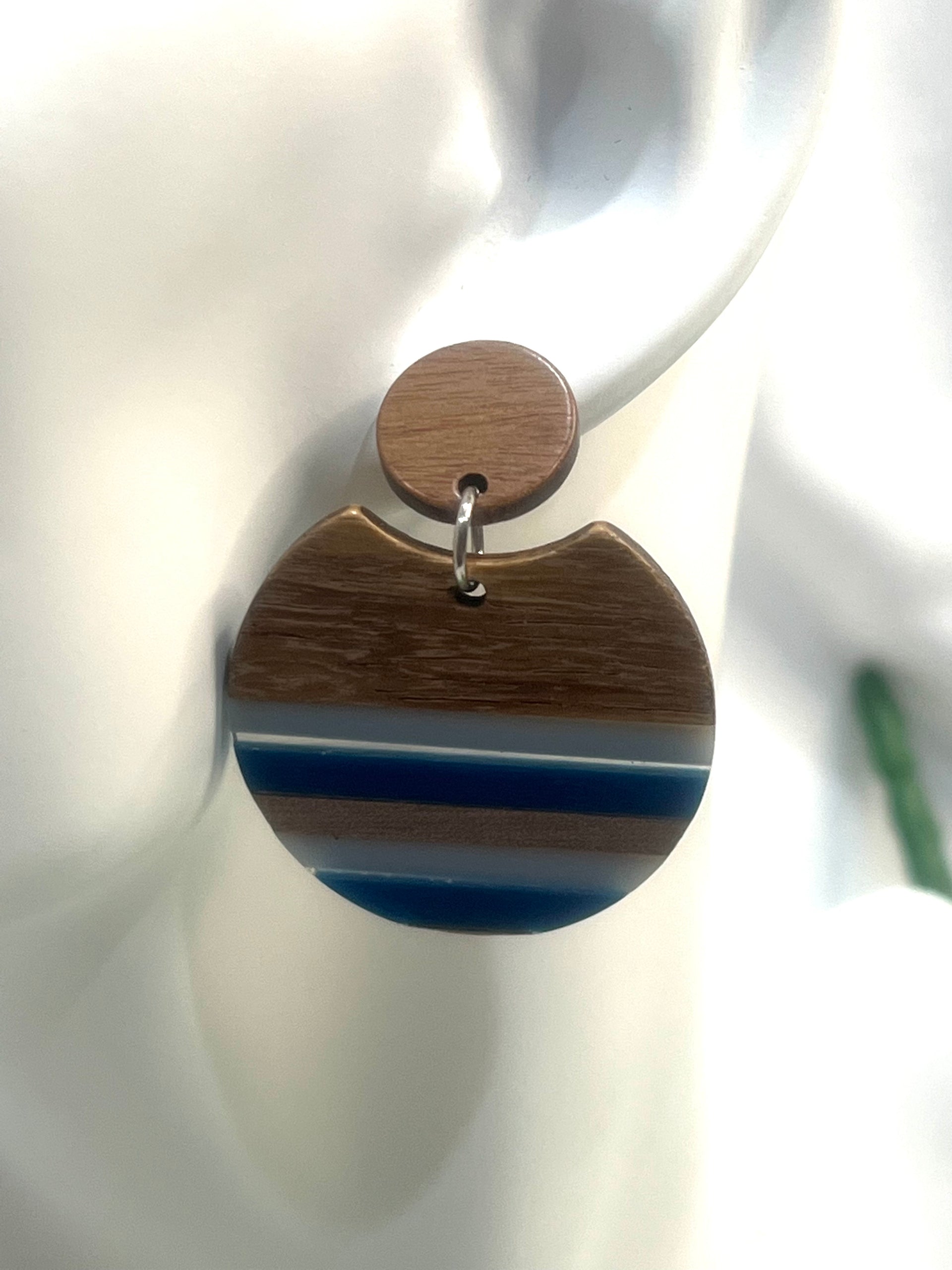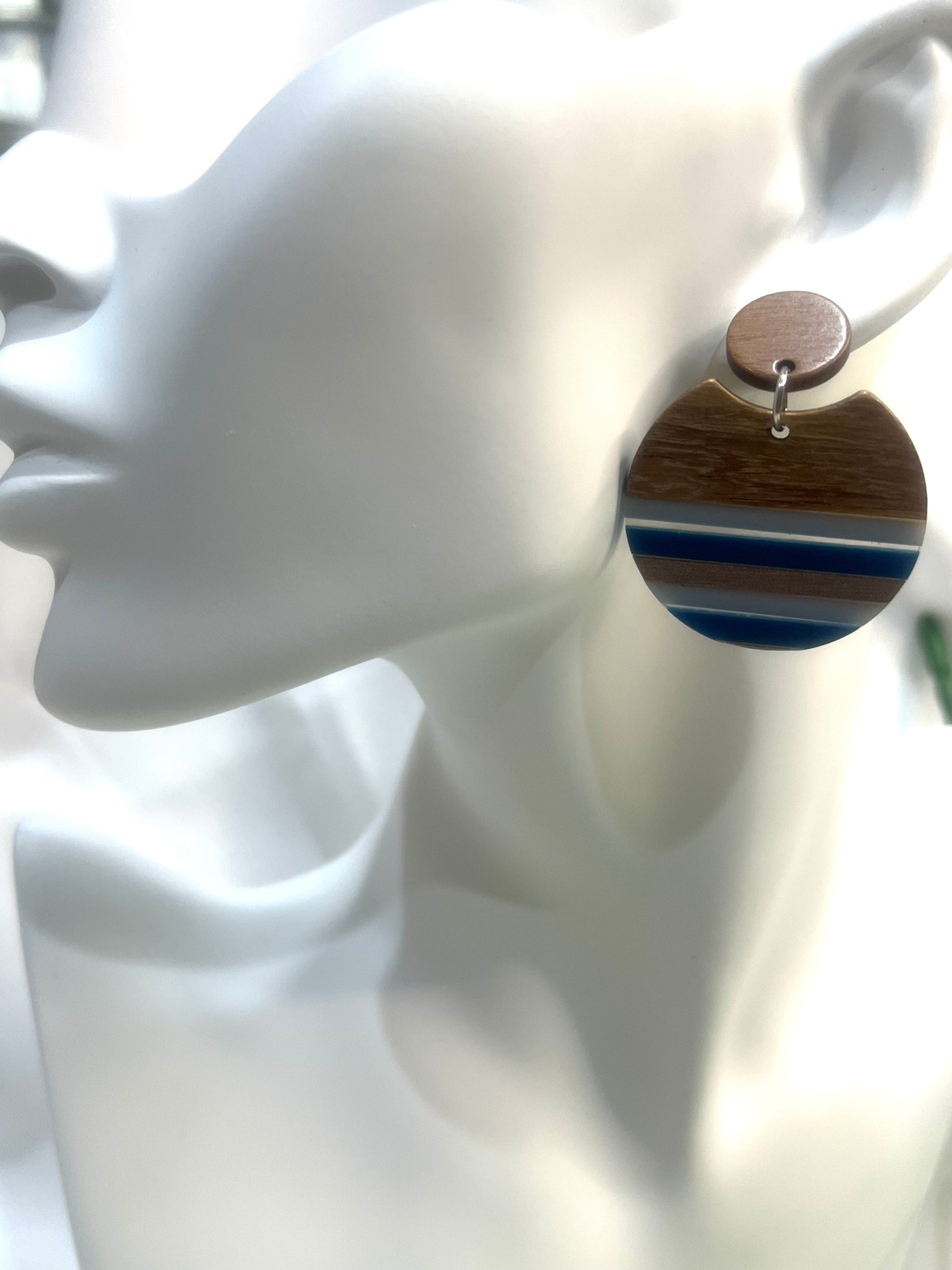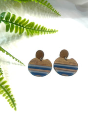 Blue Denim Stipe Wood & Resin Stud Dangle Earrings.