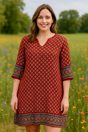 Crafted from 100% rayon woven fabric, it feels soft and breathable against the skin, making it ideal for warmer days. The non-stretch, lightweight construction provides a flattering drape, while the classic V-neckline enhances the feminine silhouette. The bold yet timeless geometric print ensures you’ll stand out whether you’re styling it casually for daytime outings or dressing it up for special occasions.