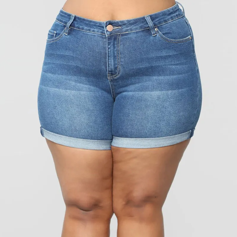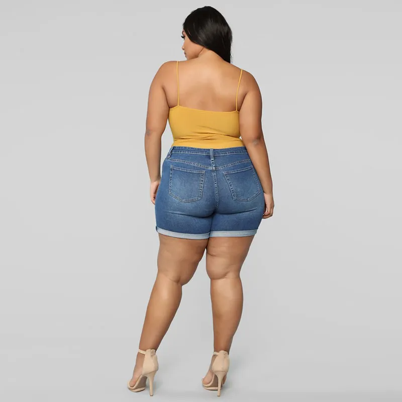 Plus Size Button Fly High Rise Denim Shorts, Women's Plus Casual Medium Stretch Jean Shorts