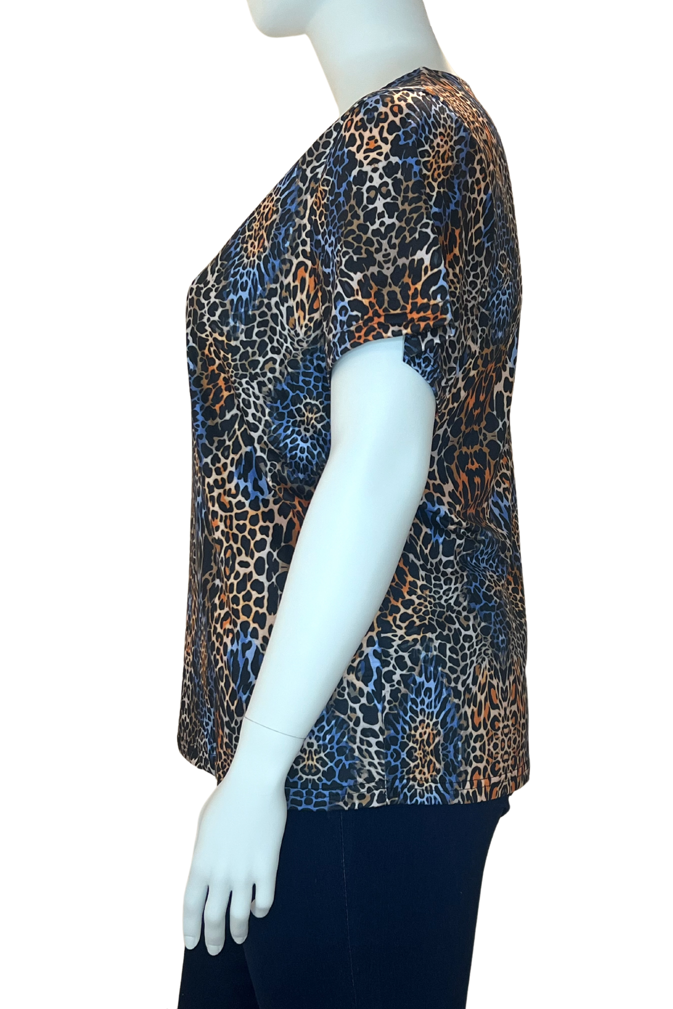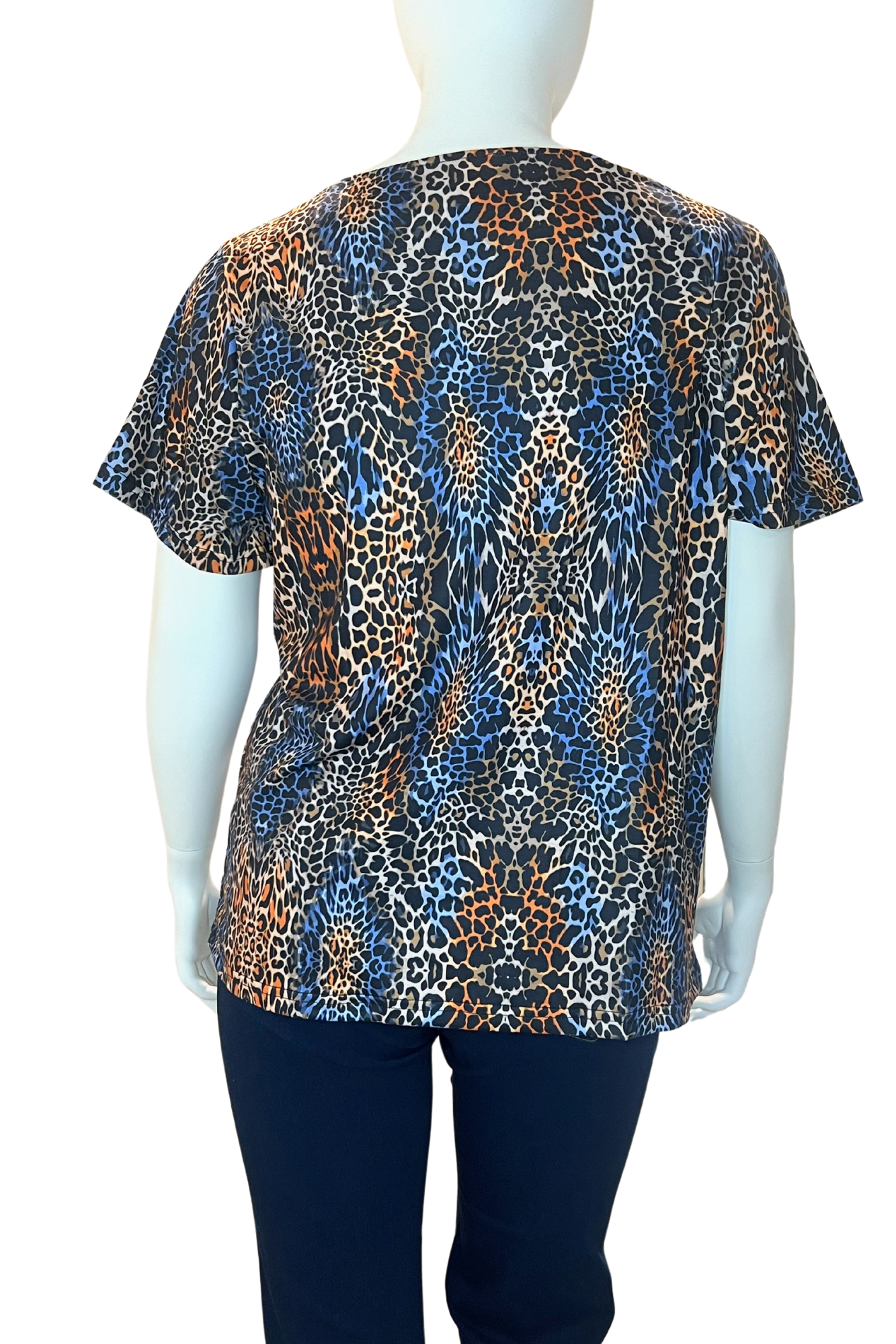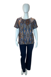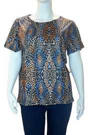 Introducing our Stunning Blue Tone Leopard Print Crew Neck Plus Size Top! Featuring a Colourful leopard print, this short sleeve women's top is the perfect addition to your wardrobe. Versatile and stylish, it can be dressed up with a skirt or dressed down with jeans. Don't miss out on this must-have piece.