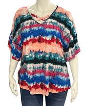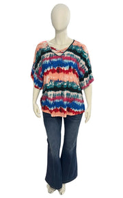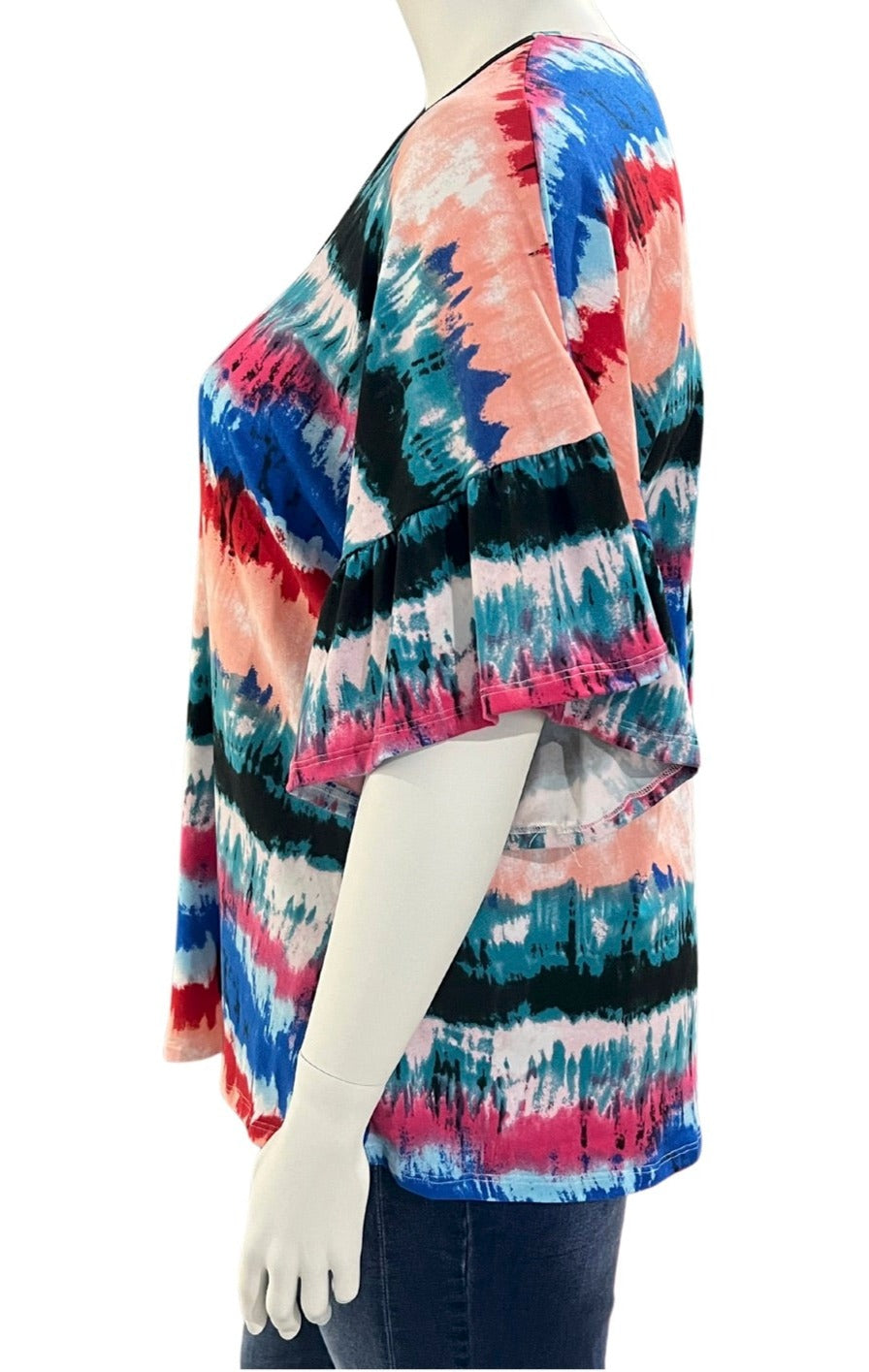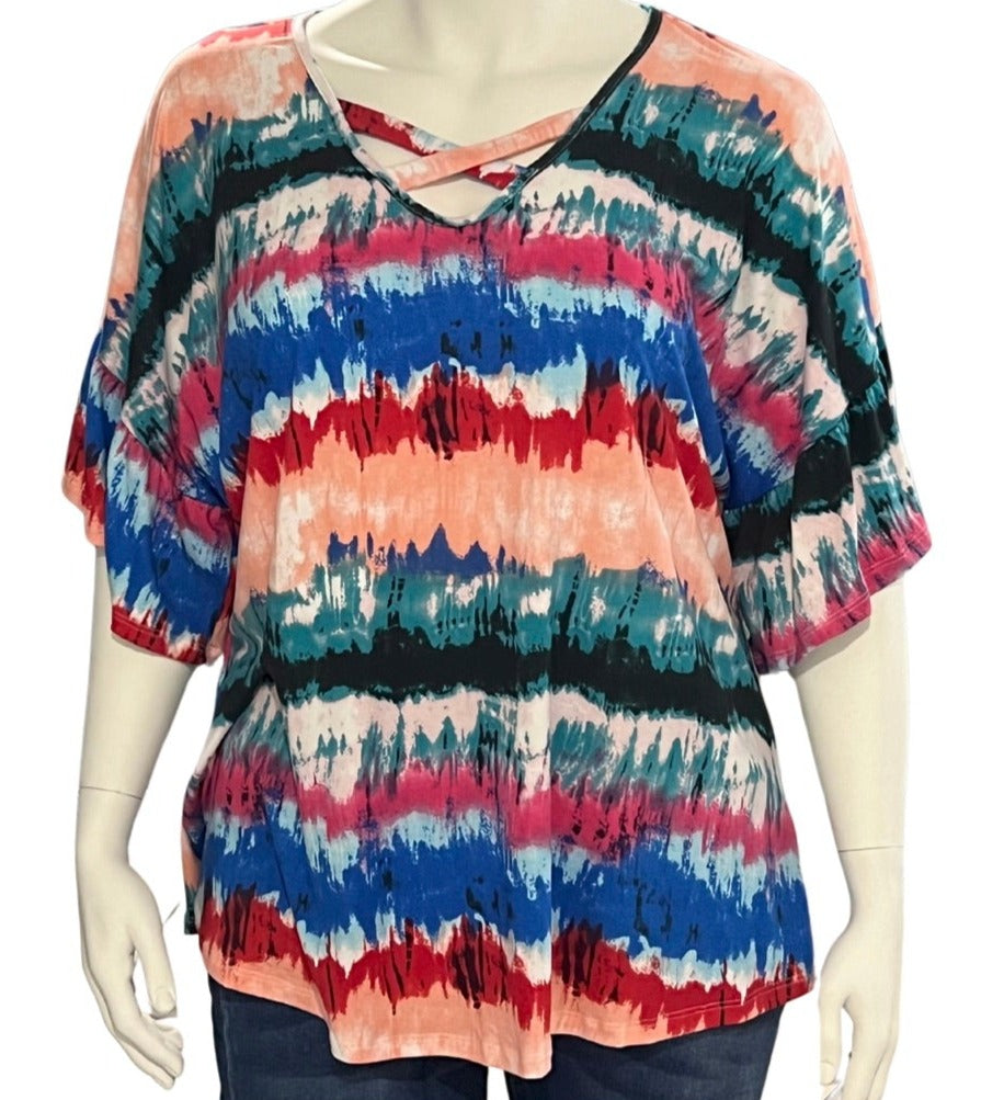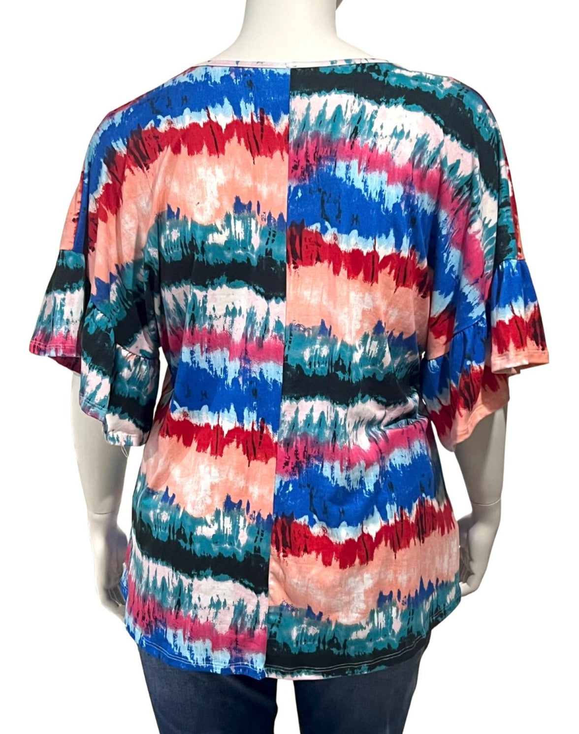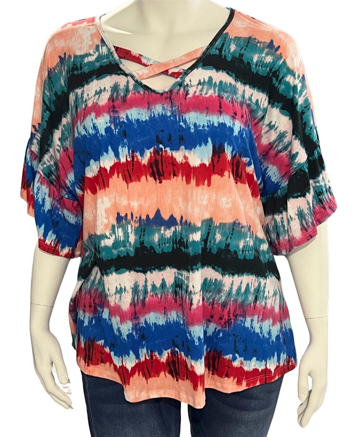 This plus size top offers a relaxed fit and features multi coloured stripes and ruffled sleeves. Made from soft quality fabric, it can be dressed up or down for a casual look. The criss cross neckline adds a stylish touch. Perfect for pairing with jeans, skirts or shorts.