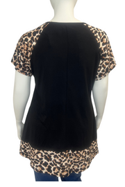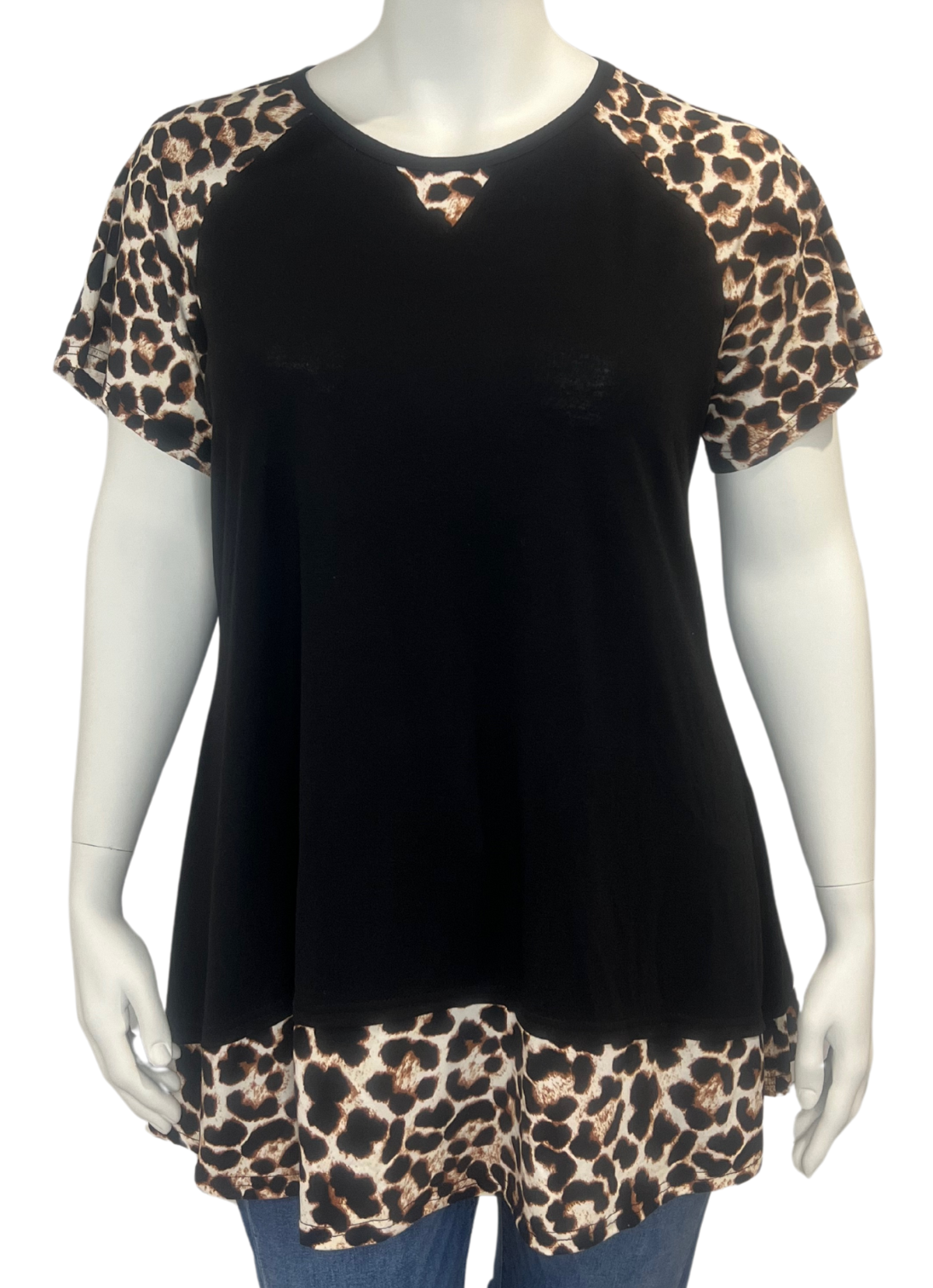 Black Plus Size Women's Top with Leopard Print Sleeves and Trim