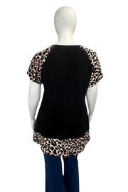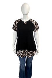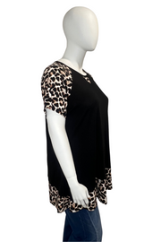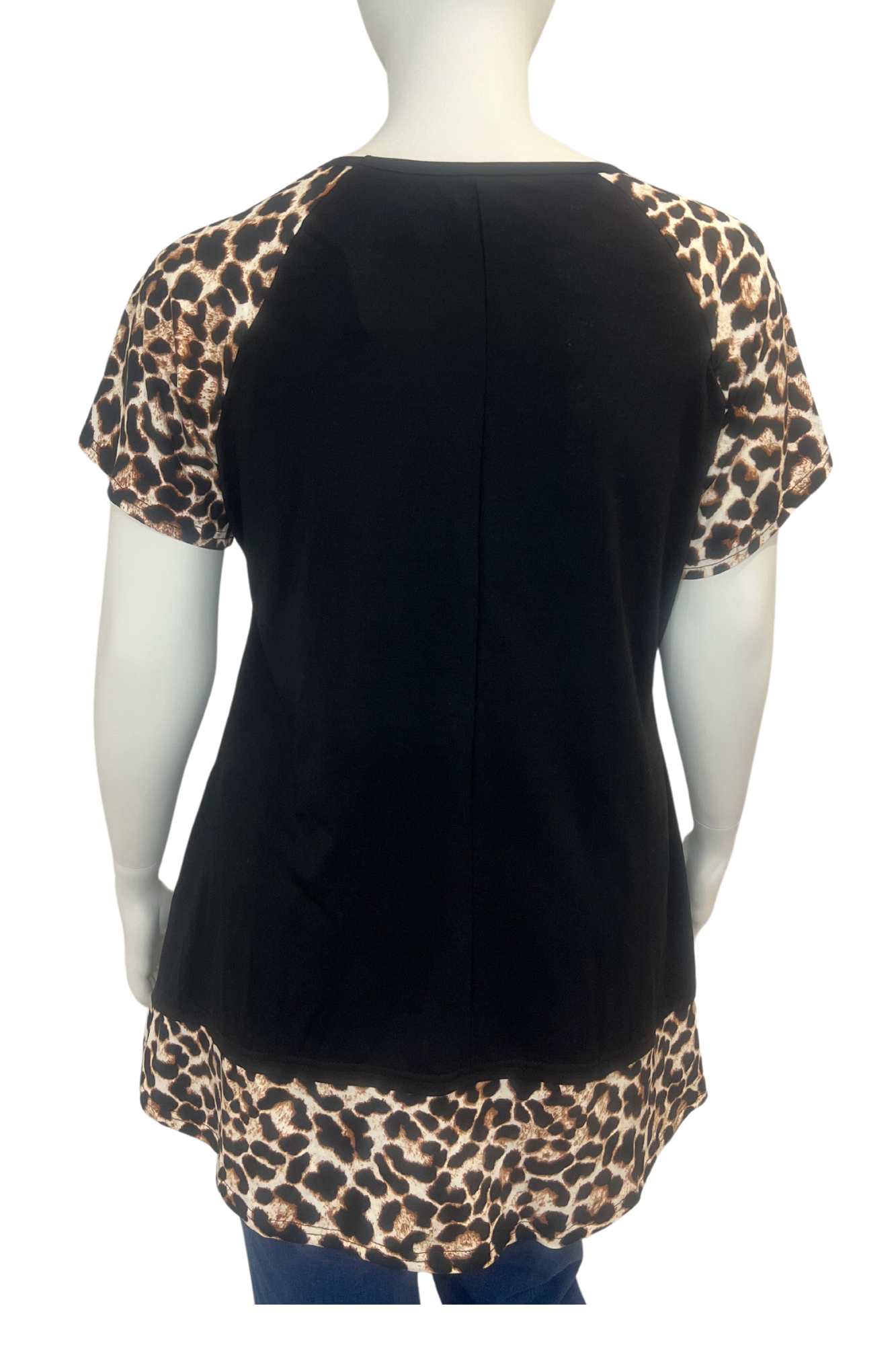 Elevate your wardrobe with this versatile and stylish Black Plus Size Women's Top featuring Leopard Print Sleeves and Trim. Made of comfortable Polyester & Elastane material, this relaxed fit top boasts a classic short sleeve and casual sleeve type. The black base colour is adorned with a captivating leopard print pattern on sleeve and bottom, making it a perfect statement piece for any season. Embrace the animal print trend and showcase your wild side with this striking top. Whether dressing up or down, this top is a must-have for any fashion-forward curvy woman. Upgrade your look today.