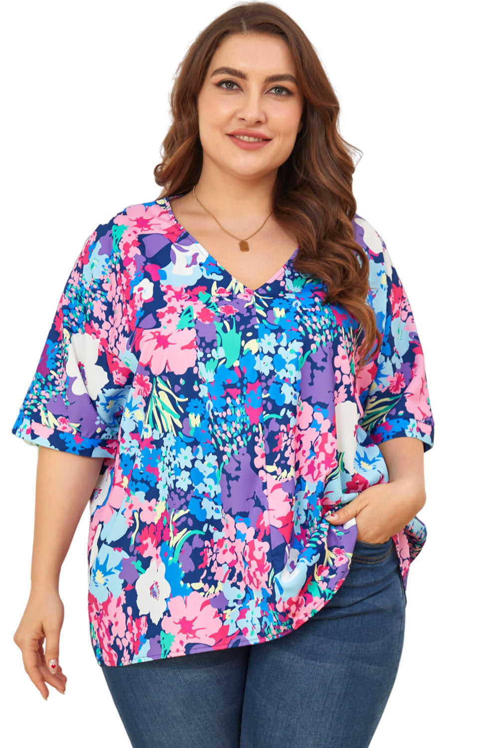 Multicolor V Neck Dolman Sleeve Plus Size Floral Blouse
