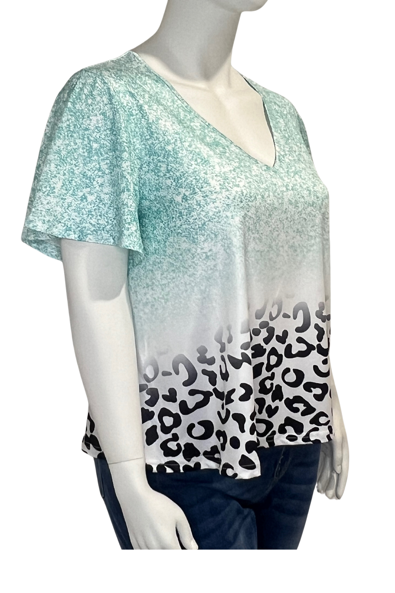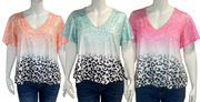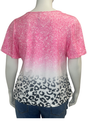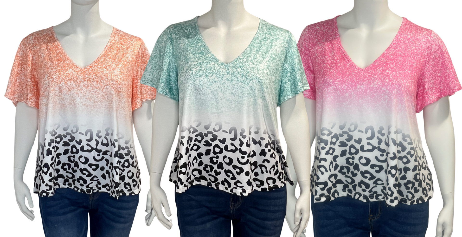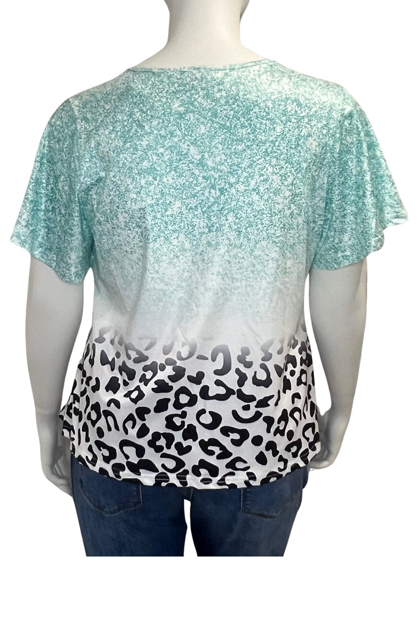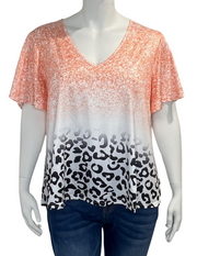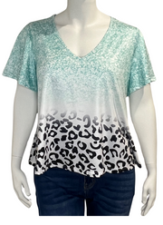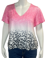 Effortlessly elevate your casual wardrobe with our Plus Size Casual Top, featuring a stunning Ombre, Leopard, Floral & Glitter Print design. This top offers a flattering V-neck and slight stretch for ultimate comfort and style. Perfect for any occasion, the short sleeves add a touch of feminine charm.