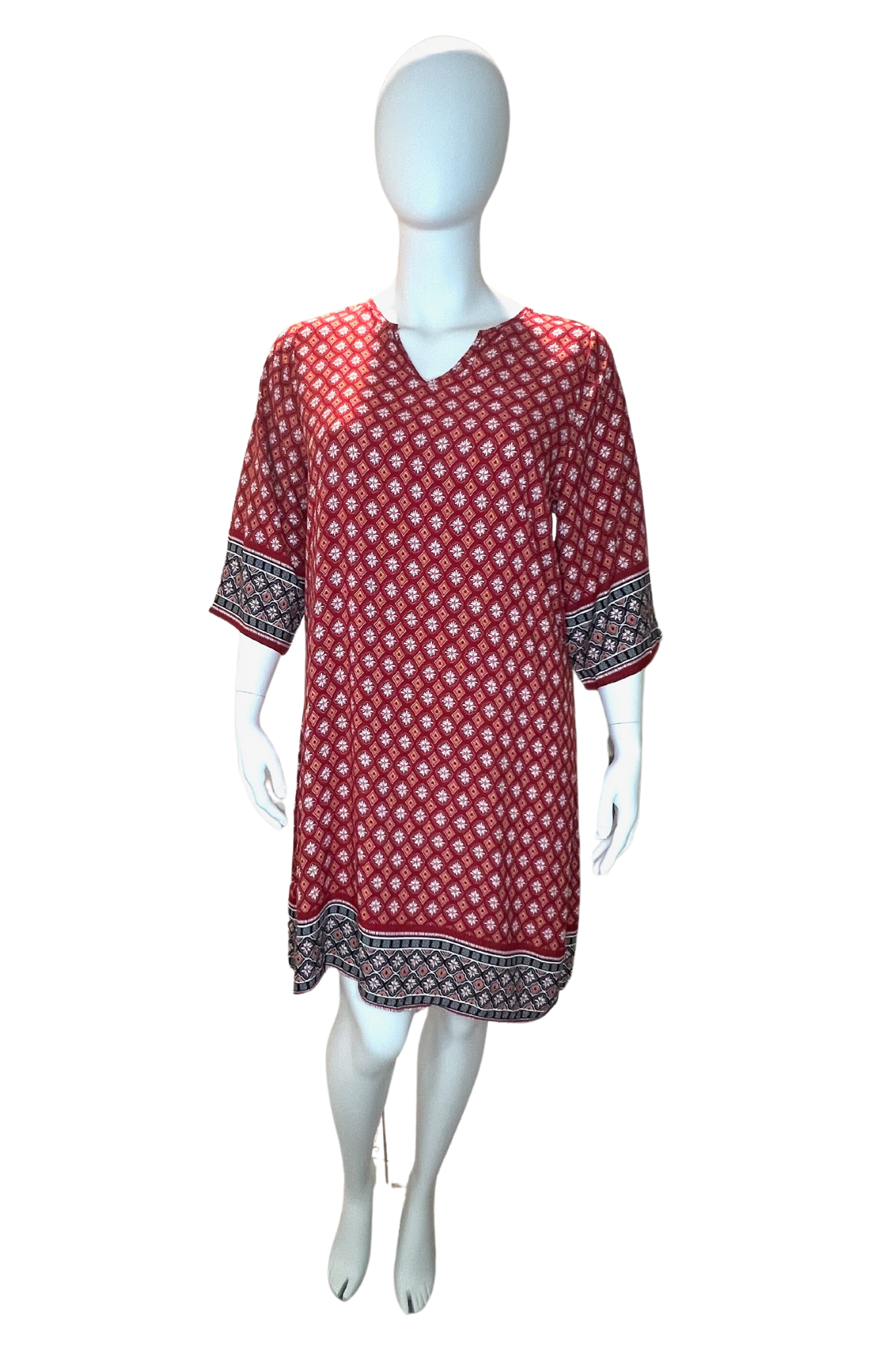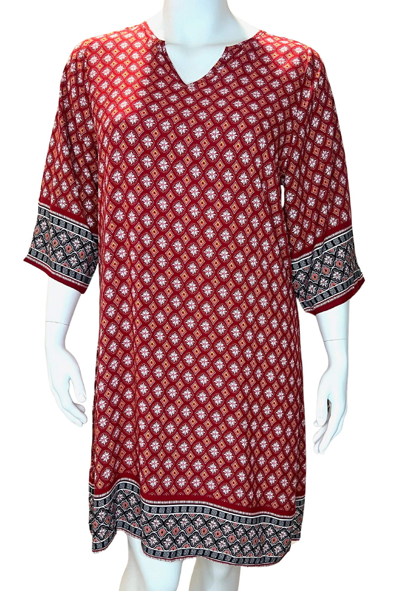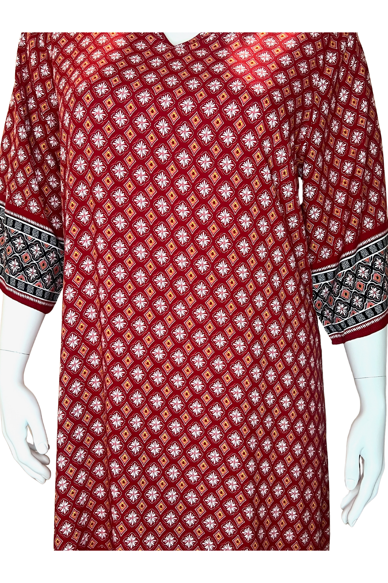 Crafted from 100% rayon woven fabric, it feels soft and breathable against the skin, making it ideal for warmer days. The non-stretch, lightweight construction provides a flattering drape, while the classic V-neckline enhances the feminine silhouette. The bold yet timeless geometric print ensures you’ll stand out whether you’re styling it casually for daytime outings or dressing it up for special occasions.