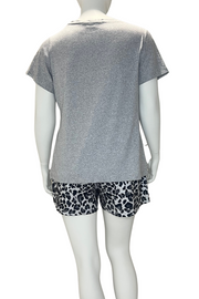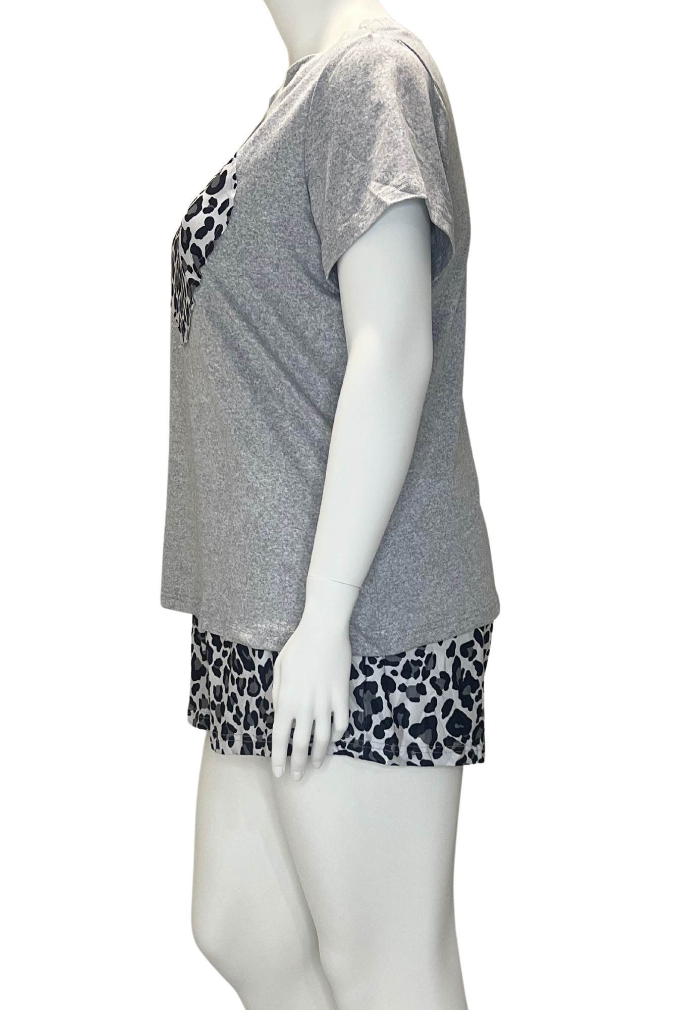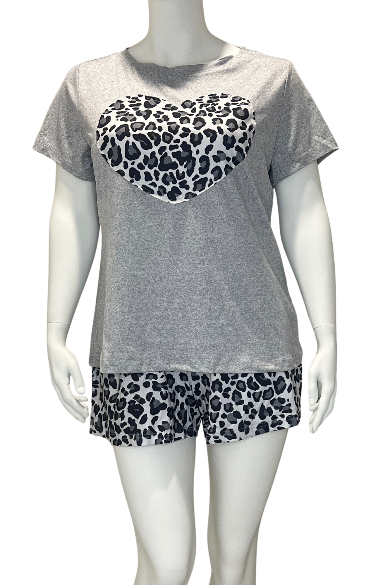 Plus Size Casual Pajama Two Piece Set, Women's Plus Leopard Heart Print Short Sleeve Tee & Shorts Pajama Pyjama 2 Piece Set