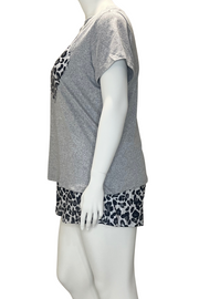 Introducing our Black & Grey Leopard Print Plus Size Casual Pyjama Two Piece Set, perfect for a cozy night in or a lazy weekend morning. Made with soft and breathable fabric, this set offers a flattering and comfortable fit for plus size women. The playful leopard heart print adds personality, while the versatile design allows for easy mix-and-match.