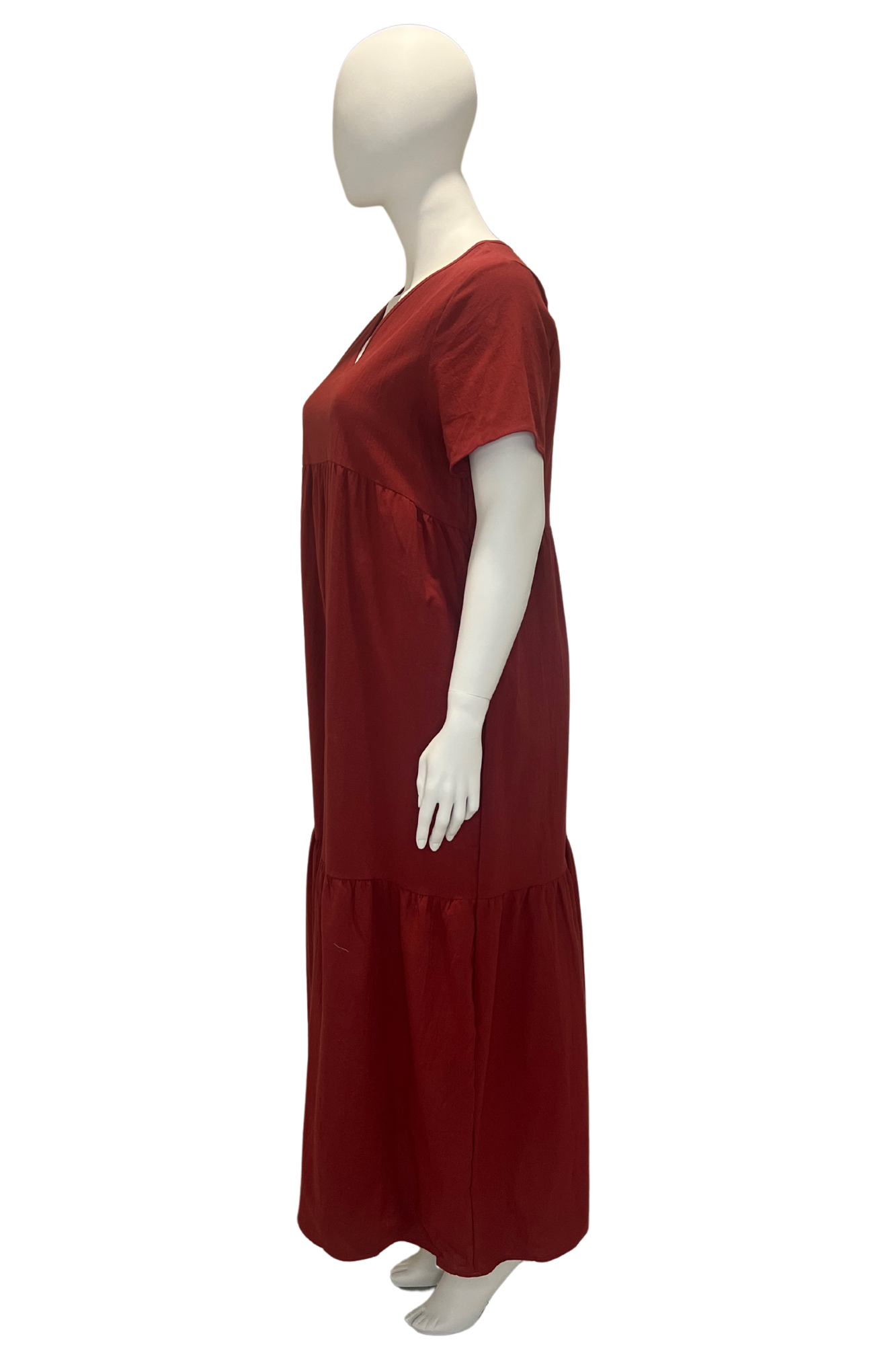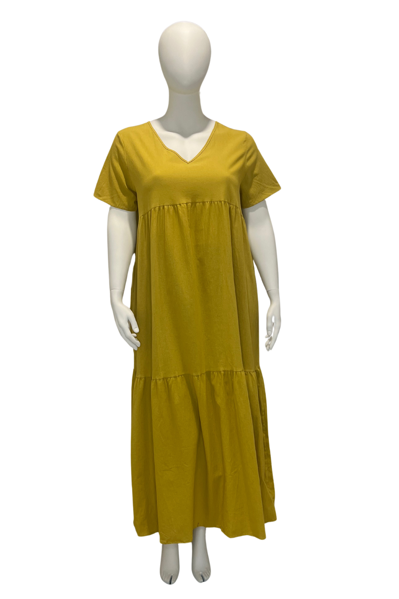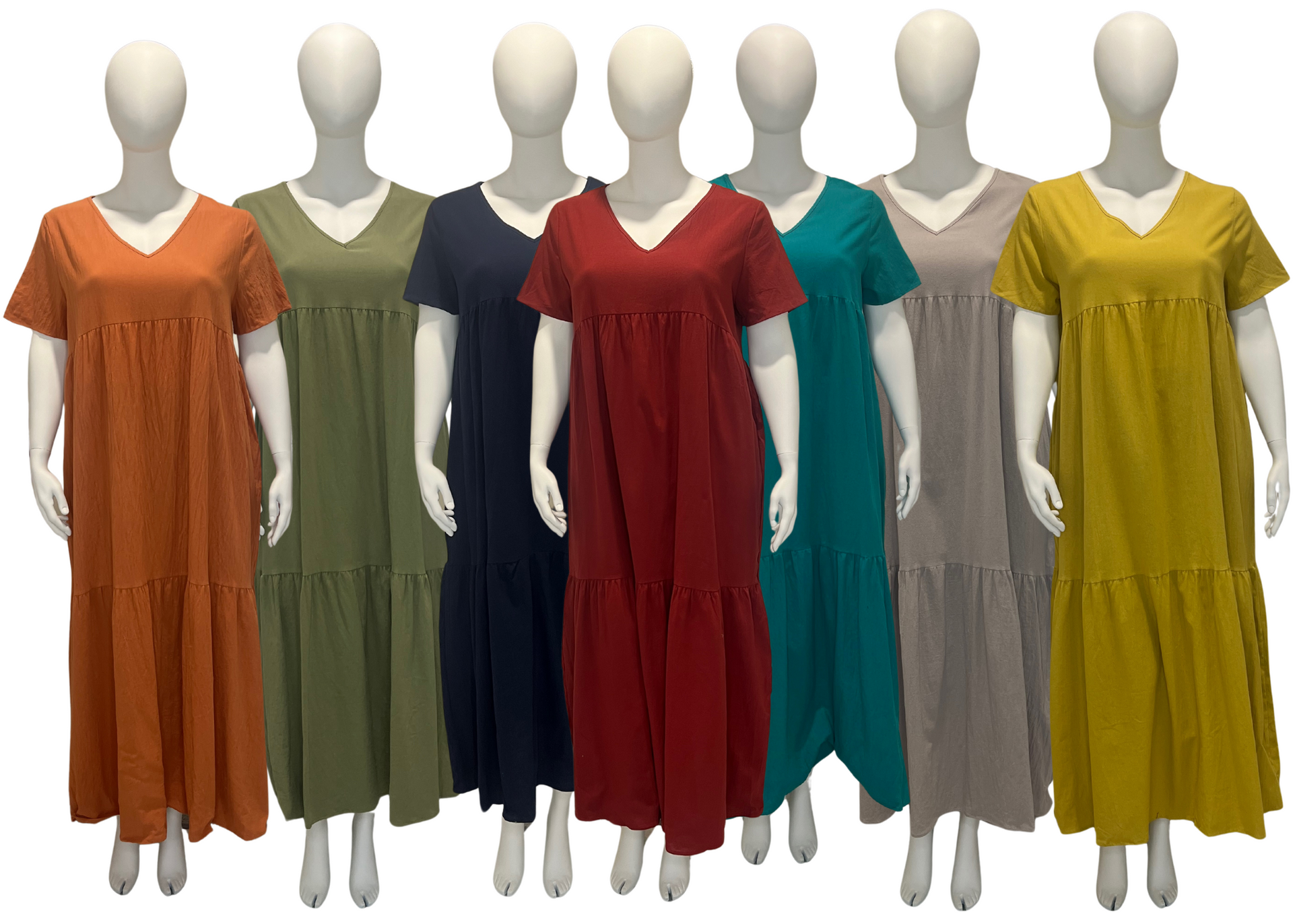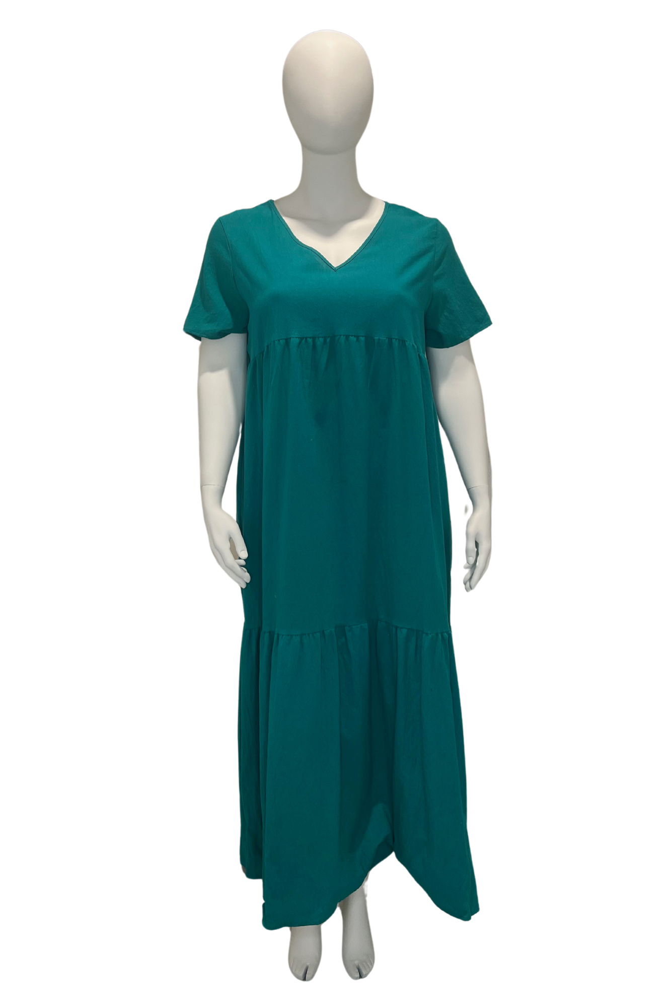 This beautiful, three-tiered maxi dress is perfect for plus-size women, featuring a flattering v-neck and relaxed fit. Made from cool and comfortable cotton linen, it's available in 7 different colours. Elevate your casual wardrobe with this stylish and comfortable dress.